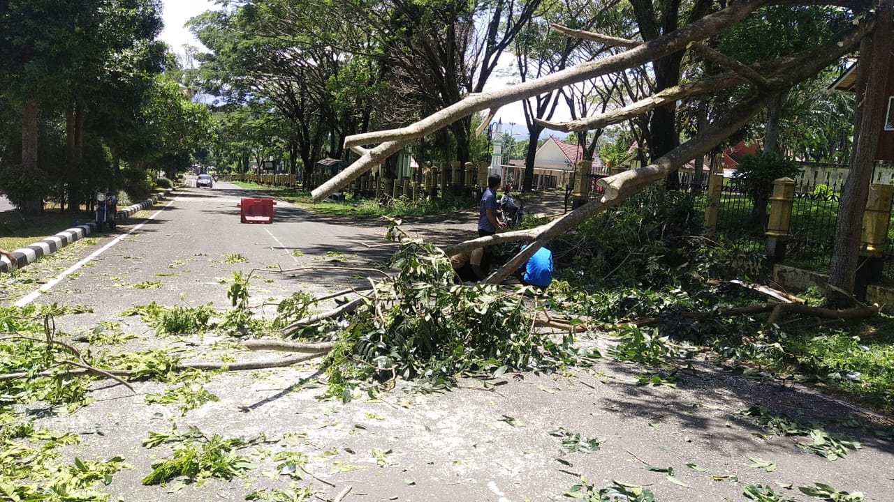 Foto Ist Pagaralam PosPANGKAS DAHAN Petugas BPBD Kota Pagaralam lakukan pemangkasan batang dan dahan pohon yang tumbang akibat diterjang angin kencang PAGARALAM POS Pagaralam Brakk Seketika pohon tembesi itu tumbang badan jalan pun sepenuhnya tertutupi batang dahan hingga ranting pohon Inilah gambaran peristiwa pohon tumbang terjadi di wilayah jalan menuju Perkantoran Gunung Gare tak jauh dari Kantor BNN Kota Pagaralam Rabu 16 2 Mendapati kejadian ini pengendara sepeda motor dan mobil berjibaku kerjasama berupaya menyingkirkan pohon tumbang tersebut sehingga arus lalulintas kendaraan bisa kembali lancar Cuaca ekstrem dengan angin kencang berembus sejak pagi hari tak sedikit membuat sejumlah tanam tumbuh roboh Seperti halnya sebuah pohon di kawasan Vila MTQ berlokasi di Kompleks Perkantoran Gunung Gare roboh dan menutupi badan jalan Bahkan tak hanya satu dengan jarak kurang dari 200 meter satu batang pohon lagi roboh berikut ranting rantingnya yang rapuh ikut berserakan di badan jalan Menanggapi kondisi cuaca ekstrem ini Kepala BPBD Kota Pagaralam Jon Hasman melalui Kabid Kesiapsiagaan Bencana Syahirul SP menuturkan jika di tengah kondisi cuaca kurang bersahabat ini perlu sekali adanya peningkatan kewaspadaan terutama bagi para pengendara sepeda motor dan mobil ketika melintas Hari ini ada 6 lokasi titik pohon tumbang yakni di derah Dempo Park ada 3 titik setelah itu di depan Vila MTQ 2 titik lokasi dan 1 lokasi lagi jalan tanjakan menuju Kantor BNN Kota Pagaralam Dan kita pun telah melakukan upaya pembersihan terhadap batang pohon yang tumbang tersebut jelas Syahirul Beranjak dari hal tersebut sambung Syahirul pihaknya senantiasa mengimbau kepada masyarakat harus tetap selalu waspada Tingkatkan terus kewaspadaan terutama hindari pohon yang tinggi dan rentan roboh imbuhnya Cg09 CE V